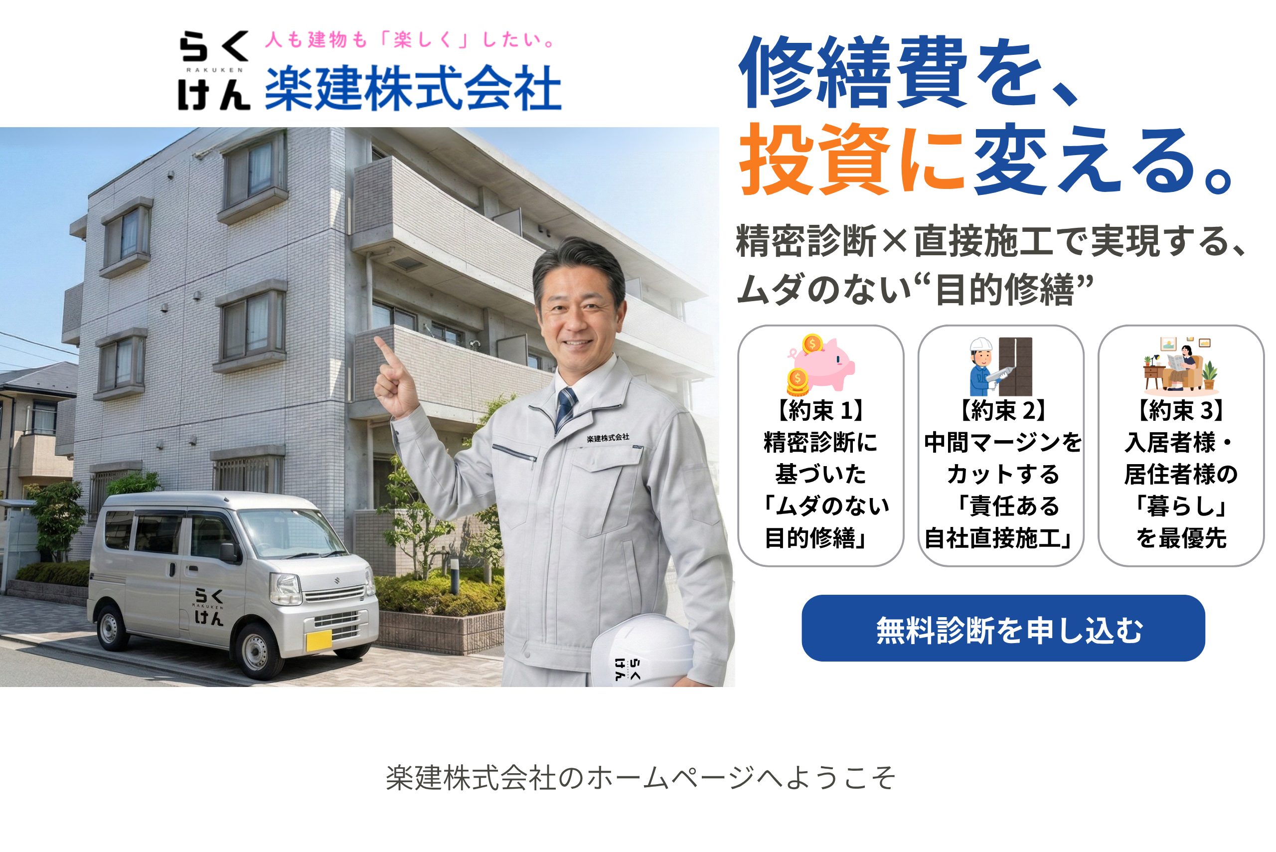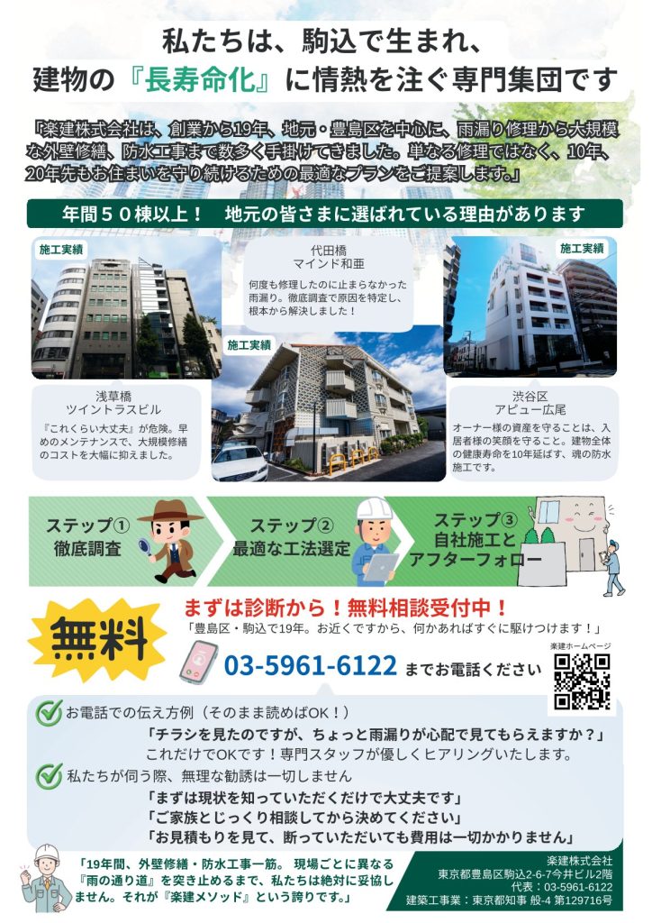 「積立金が足りない」「雨漏りが止まらない」「管理会社の見積もりが高い」……。 そんな住まいのSOSを、徹底した調査・分析で紐解き、最新技術と直接施工によるコスト削減で解決します。大切な資産の未来を、私たち楽建株式会社と一緒に考えませんか?