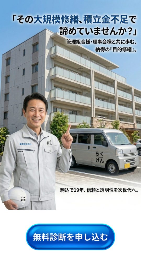 積立金不足は多くの管理組合様が抱える切実な問題です。私たちは、全ての箇所を一度に直す「フルパッケージ」の工事ではなく、建物の寿命を守るために本当に必要な箇所を見極め、予算に合わせて優先順位をつける「目的修繕」を得意としています。