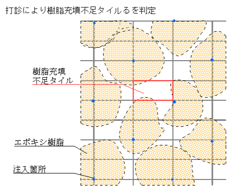 外壁タイルの剥離が進⾏すると、躯体とタイル層の間に空隙が⽣じ、テストハンマーで叩くと空隙⾳が発⽣する。その⾳によりタイルの浮陸部を判定する。