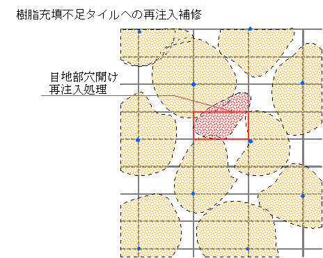 45モザイク磁器タイルは、45㎜×45㎜厚みは6㎜程度です。タイル面に加わる外力(熱膨張収縮や振動などや自重)により剥離することがあります。タイル浮陸部では浮陸した部位を十分に補修すれば再発は防げます。通常の浮陸箇所においては、エポキシ樹脂注入による施工で対処します。 浮陸した45二丁タイルについては4枚に1箇所目地交差部への注入ピンニングをおこないそれぞれのタイル下地の裏面を接着剤で固定する施工を提案しています。